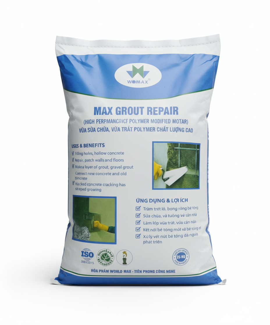 | MAX GROUT REPAIR is a special, non-shrinkable polymer mortar. Just add water to get a high-strength, non-oxidizing, non-toxic, high-strength bonding mortar. | MAX GROUT REPAIR là vữa gốc xi măng polymer đặc biệt, không co ngót. Chỉ cần đổ thêm nước để được hỗn hợp vữa sửa chữa kết dính cường độ cao, không ăn mòn, không bị oxi hóa, không độc hại |